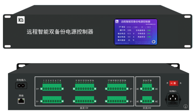 远程智能双备份电源控制器是集远程控制管理、电源智能备份、电力参数监测、温度监测等功能于一身的新一代智能安防供电设备。 采用UDP/IP方式实现远程管控,且可对输出电压、输出总电流和设备内部温度进行实时监测。远程智能双备份电源控制器不仅可以减轻系统管理人员工作压力、降低维护成本的,也能最大限度的缩短用电设备的故障排除时间,同时用户还可以合理的按照时间规划下联设备的电源供给,达到节能减排的效果。